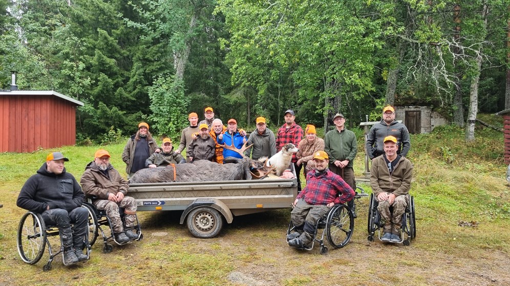 Deltagarna i Jakten för allas älgjakt 2025 var från vänster: Robert Bergman, Ronny Chr Bratsberg, Carolina Persson Norell, Martin Häll, Melker Holm, Tomas Rooth, Henrik Frisk, Peter Karlsson, Jens Eriksson, Pontus Axgart, Jerry Linander med hunden Tanja, Ida Hallberg Viden, William Jonsson, Jonas Eliasson, Janne Karlsson, Jörgen Linander. Foto: Jörgen Linander