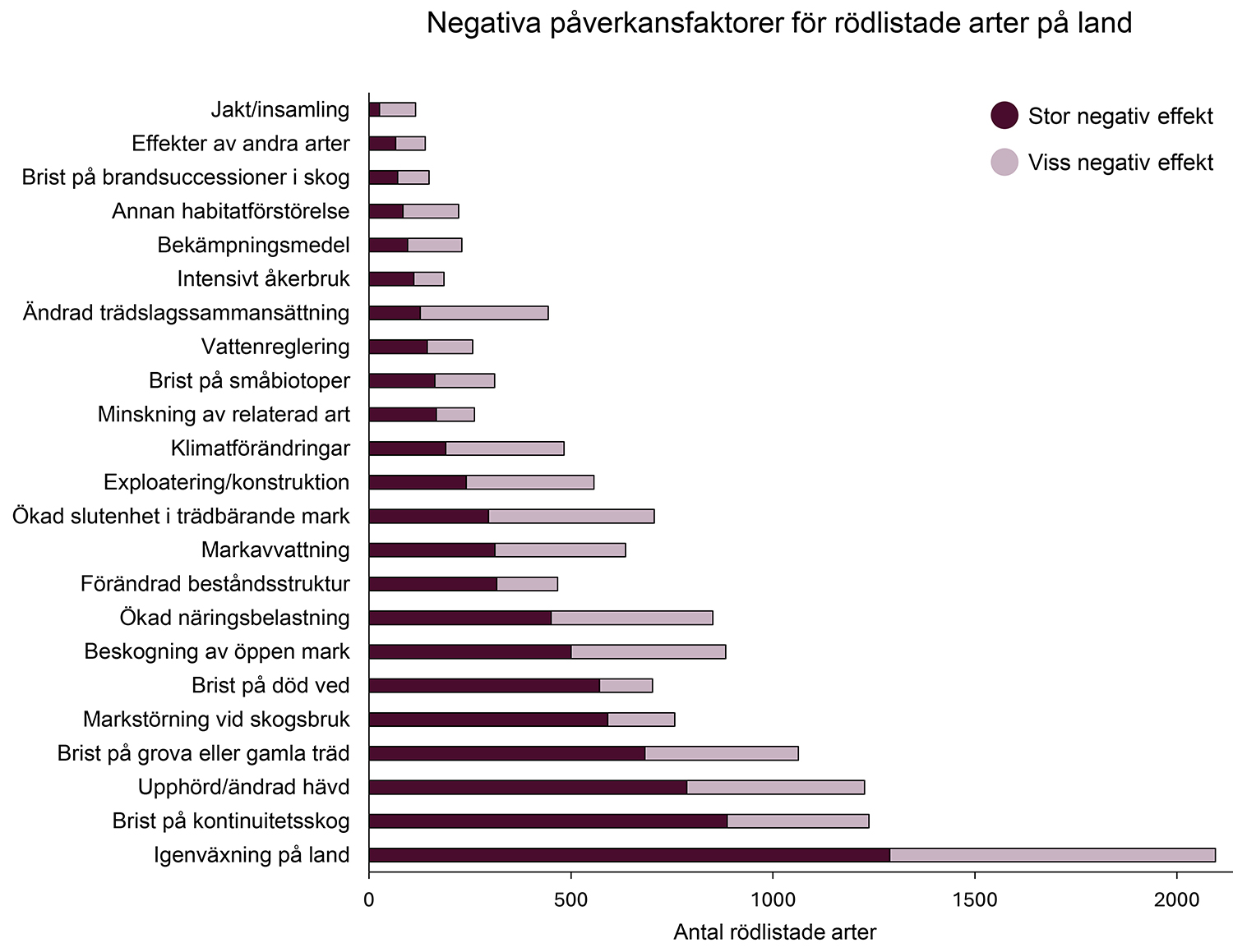 Översikt av de negativa påverkansfaktorerna för rödlistade arter som förekommer på land (n = 4 525). Igenväxning och brist på kontinuitetsskog är de faktorer som bedöms påverka flest rödlistade arter på land. (Källa Artdatabanken SLU)