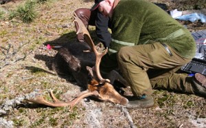 Halsbandet sattes på och prover togs även på denna hjort. Naturligtvis fick han också ett namn, David. Anledningen till det är att Leif Carlströms svärson och tillika högra hand under jakterna heter David. Så jag kände att det kunde vara trevligt att hedra honom genom att namnge en hjort efter honom.
